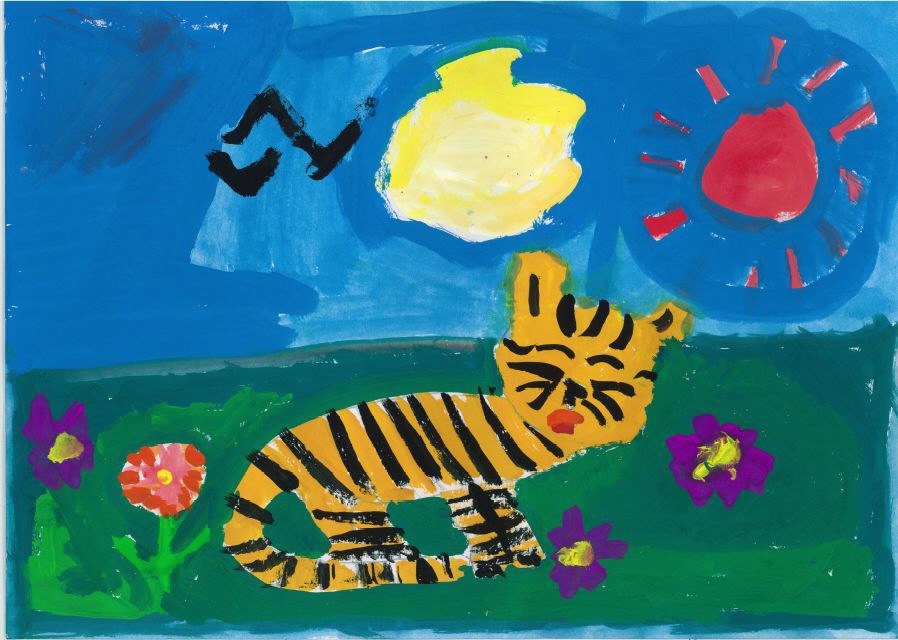 屋台のくじびきであたったとらがおひさまでにこにこしています。