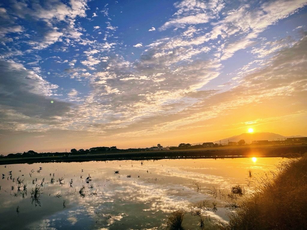 田植え前の水田に映る朝焼けが、静かな一日の始まりを告げる。